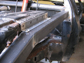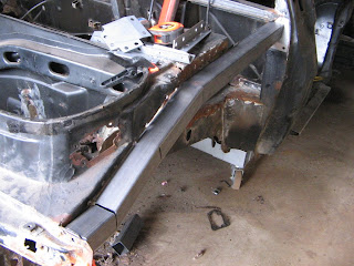 July 27 2009, the car is completely disassembled, not even one bolt or wire left on the chassis, started cutting out all the rust and replacing frame pieces with new metal.