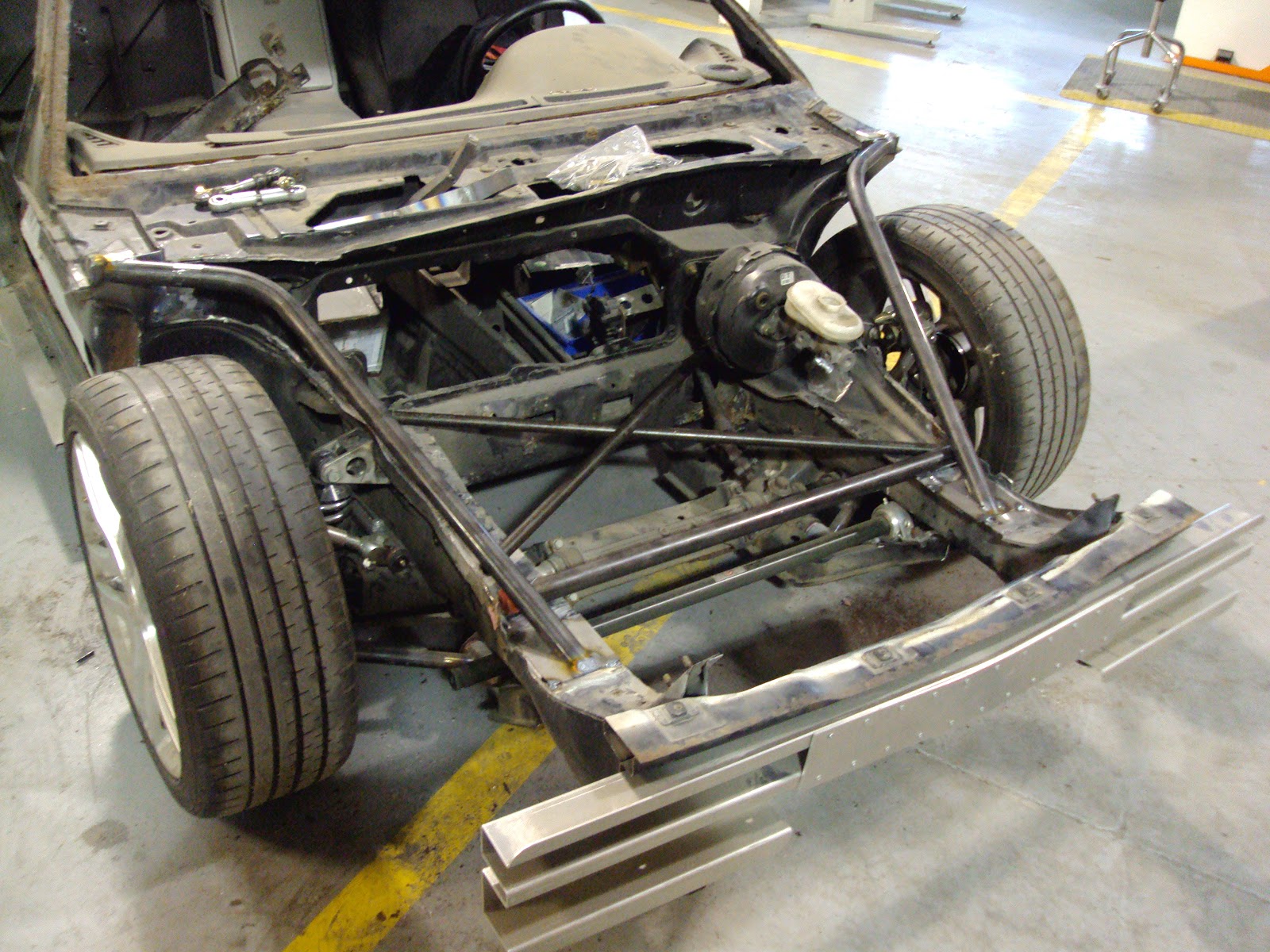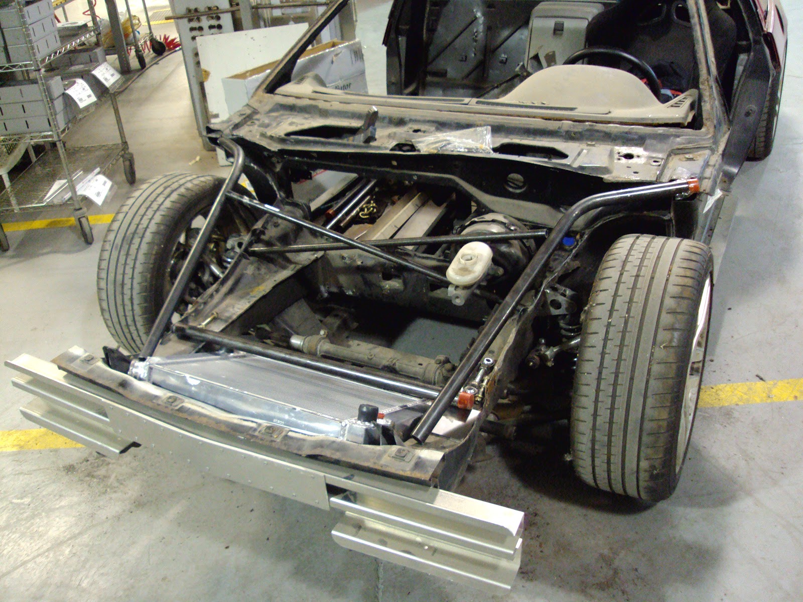 After looking at the stock sheet metal I realized that there is a significant frame support there as well, so I aimed to help the support of the chassis in a similar fashion that I did in the rear end with tubular steel. I got a few tubular pieces and the mounting plates welded in before I had to stop, enjoy the pics.