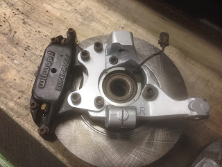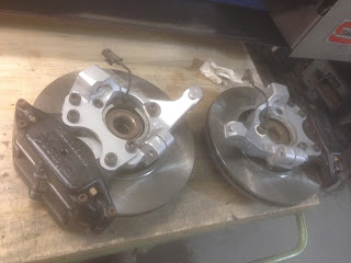 While I've been waiting for the chassis I've been busy with getting the brakes and knuckles complete, I started by getting rid of the C5 corvette rotors, there was too many issues with them, requiring too many spacers and jerry rigging. Rather I went with basic stock LSJ rotors, they were meant for those hubs and knuckles, requiring no spacers and no sketchiness, on top of that the dimensions of the rotors are pretty close to the corvette rotors save the rear ones that are solid rather than vented.......I can live with that.