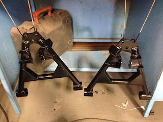 I know I'm probably going to field this question, so I'll answer it now........why am I regular painting all my components rather than powdercoating everything? My main reason is because nothing has been real world tested yet, it works and fits great when its sitting in the shop rolling around.......what's going to happen at 200+kph, I don't know, so if after testing I notice some failure of components requiring a new part or modification of the existing parts, which would suck if I had dumped a few hundred dollars getting everything powdercoated. So I'm just using regular paint for a year or so of testing and during the first or second winter I'll disassemble and send parts out for powdercoating.
